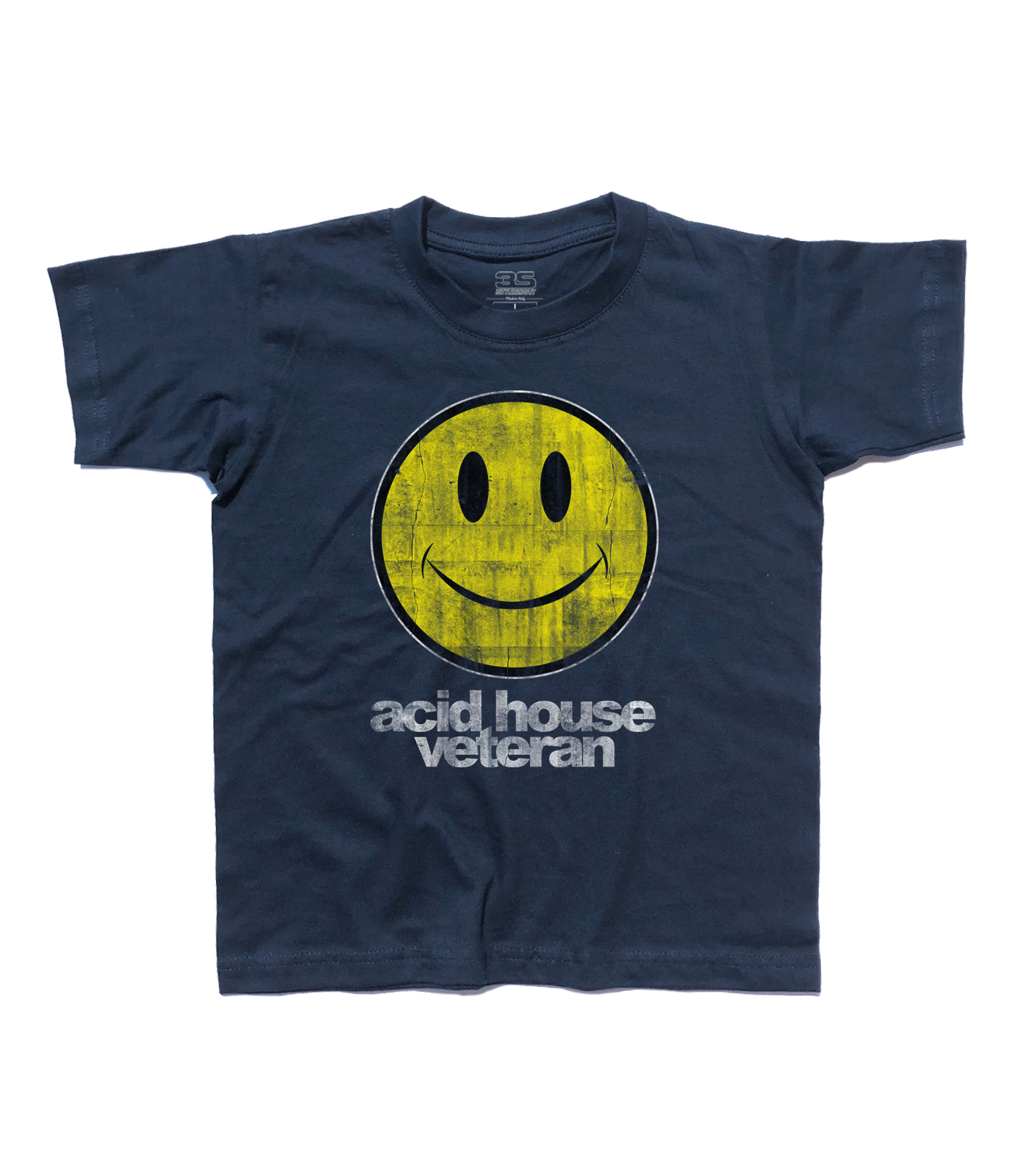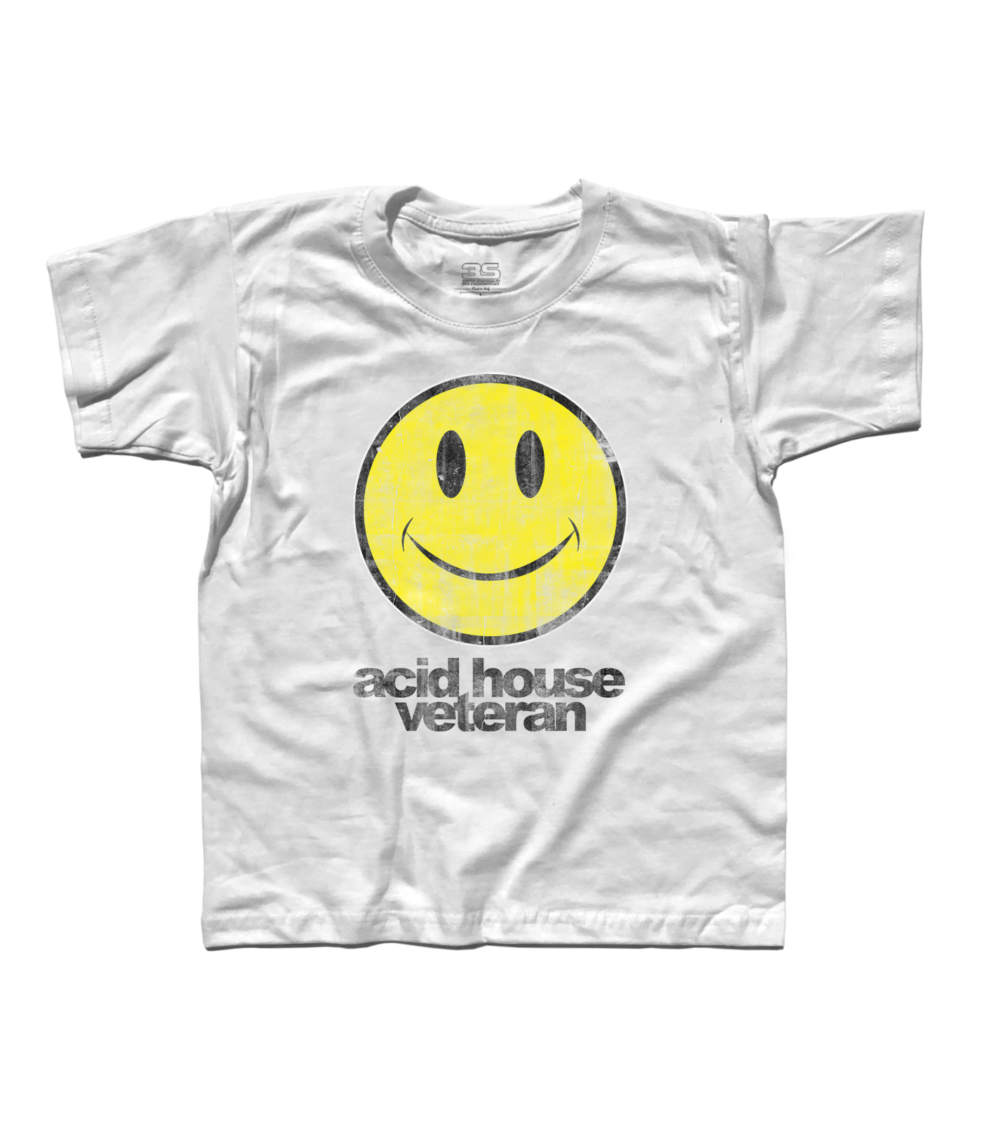Acid house t-shirt – Kid’s t-shirt depicting a smile antique and written Acid House Veteran. The Acid house is a kind of dance music born in Chicago in the late ’80s as a sub-genre of house music. Over the years has given rise to a youth movement and cultural ideology inspired hippie years 1960 1970, whose ideal was a company out of every norm and rule.