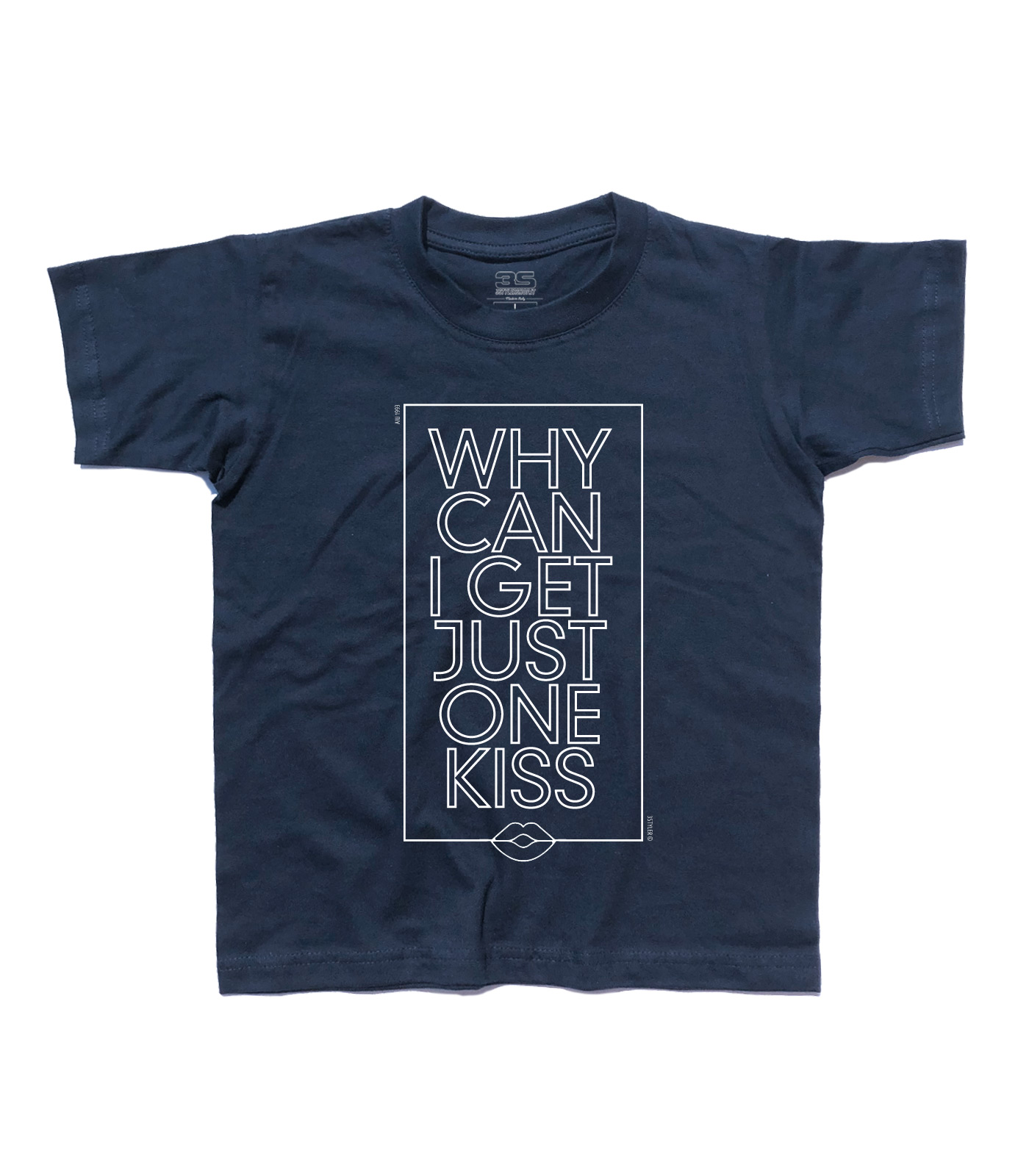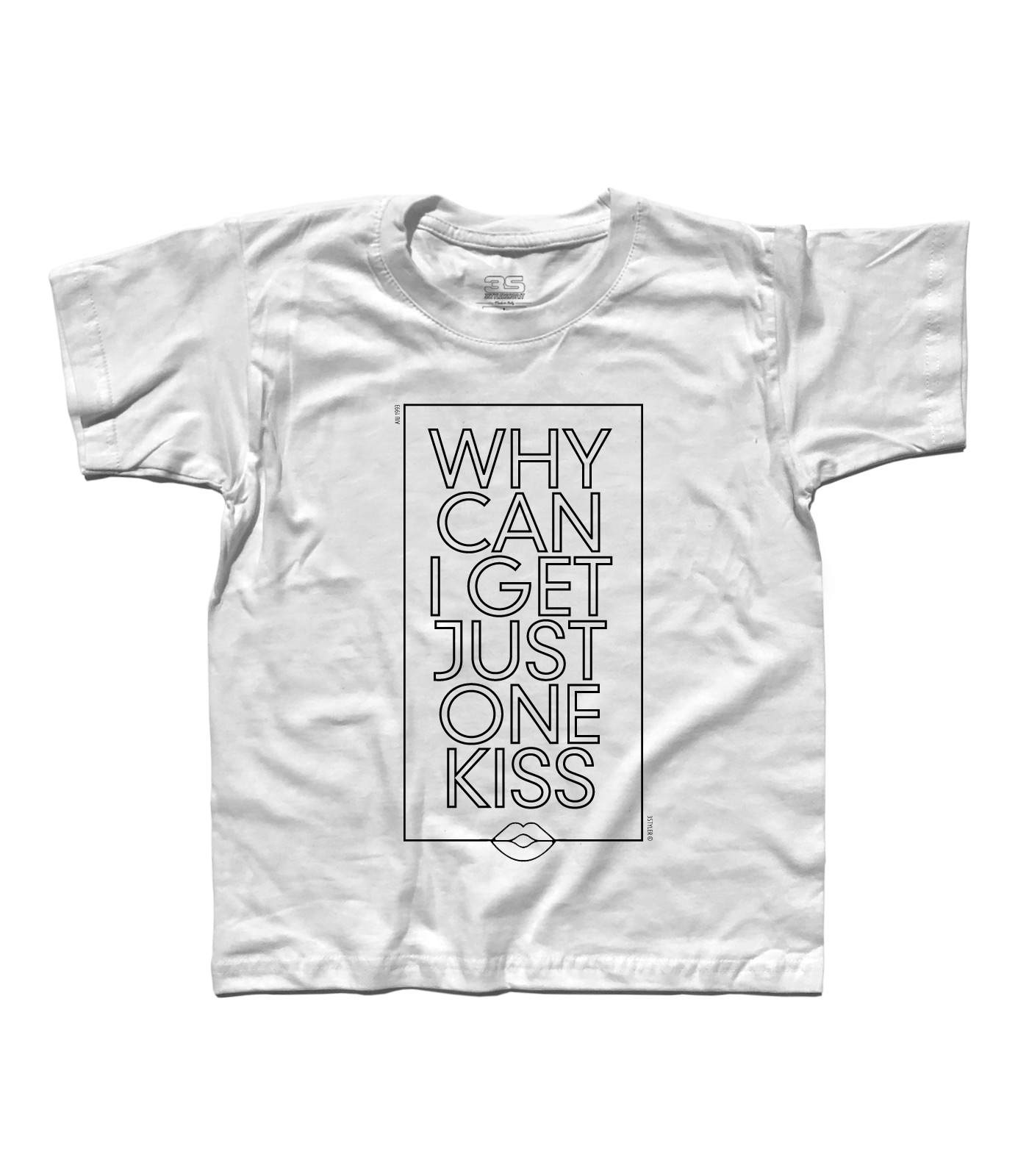 Add it Up t-shirt – T-shirt bambino ispirata alla canzone Add it Up dei Violent Femmes, con scritta “Why can I get just one kiss”. Add it Up t-shirt – Kid’s t-shirt inspired by Add it Up of Violent Femmes, with words “Why can I get just one kiss”.