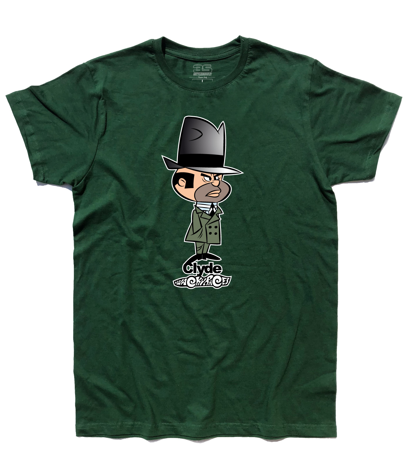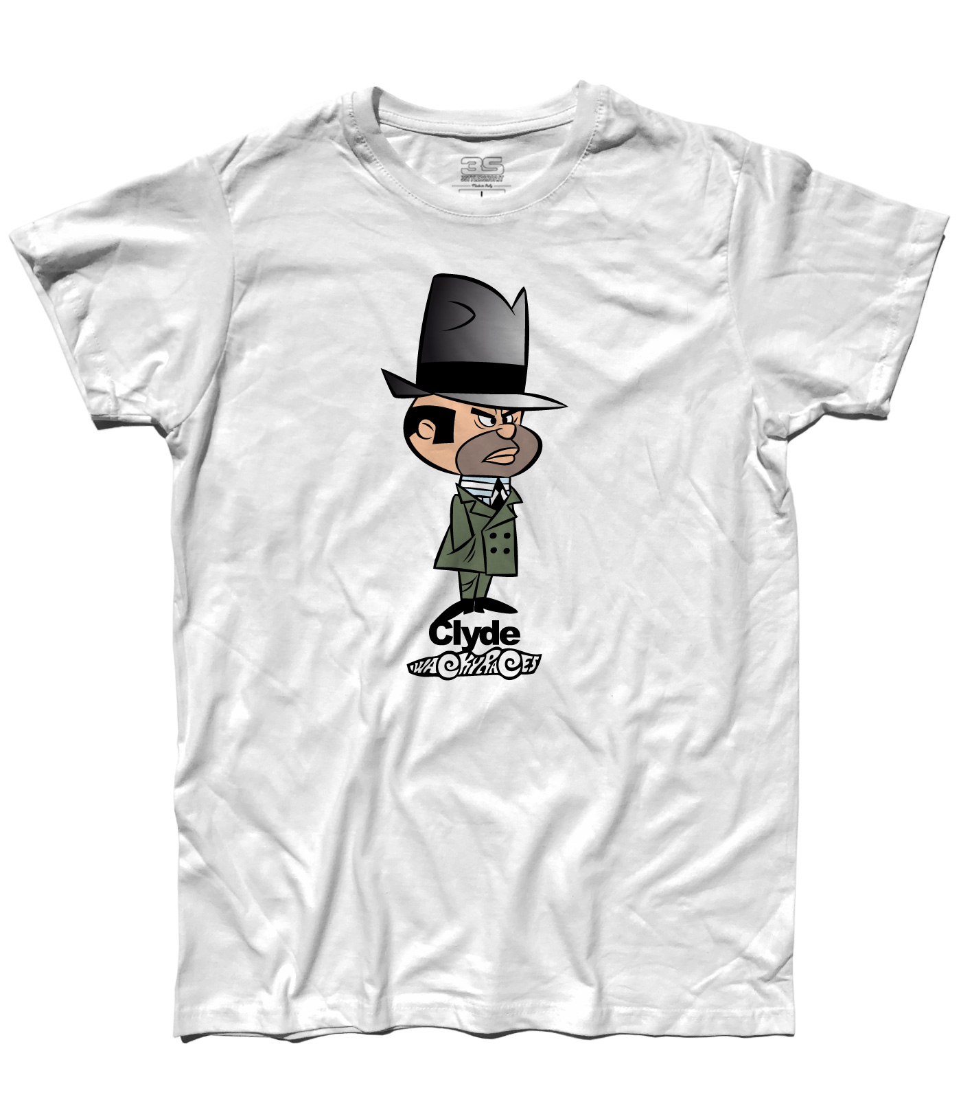 T-shirt uomo raffigurante Clyde, capo della temibile banda delle corse più pazze d’America. Si sfidano sulle strade di tutta America, dalla California a New York, passando per il Michigan e la Florida: sono i pazzi protagonisti delle folli Wacky races, il mitico cartone che in Italia ha spopolato negli anni 80. Dieci macchine stranissime, con le loro peculiarità e i loro super gadget potenzianti, dieci macchine più un duo di guastatori, deciso sempre a giocare sporco, cercando di fregare gli altri concorrenti, ma che proprio per perdere tempo a preparare sofisticate trappole non riuscirà mai a vincere nemmeno una delle 34 wacky races. A bordo della numero 7, la Macchina Antiproiettile, c’è Clyde e la sua banda. Si tratta di una gang degli anni 20 formata da sette nanetti, su auto d’epoca, capeggiata dal boss Clyde.