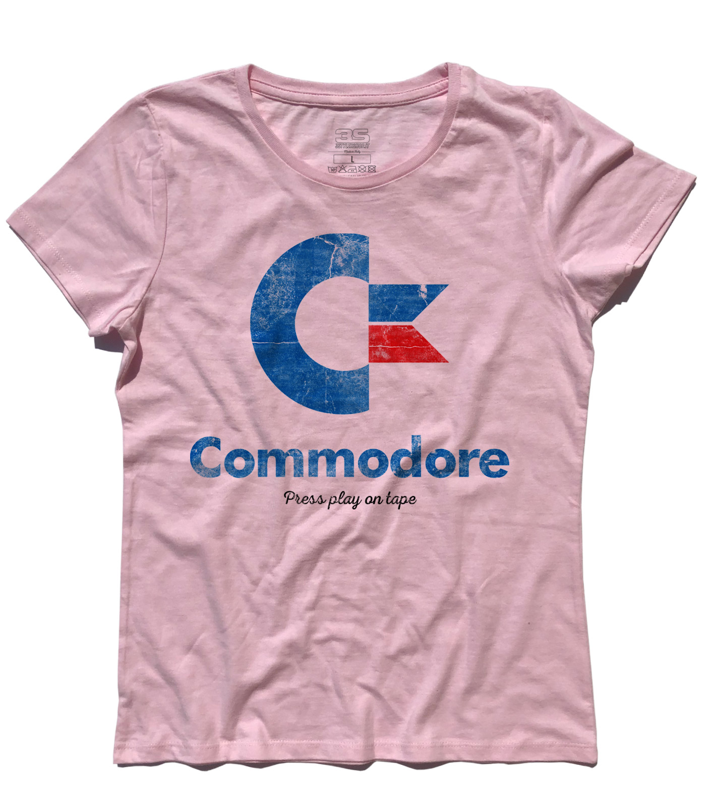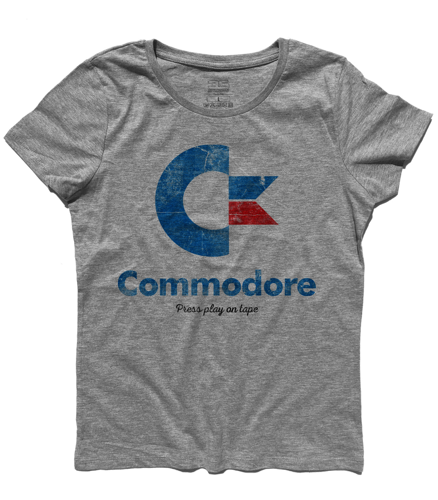 Commodore 64 t-shirt – T-shirt donna raffigurante il logo rivisitato ed antichizzato del Commodore 64 e scritta “Press play on tape”. Il Commodore 64 naque come evoluzione del Commodore VIC-20 ed è ancora oggi il computer più venduto al mondo: nel 1986 furono venduti più di 10 milioni di esemplari in tutto il mondo. Dal 1983 al 1993 ne sono stati venduti nel mondo oltre 17 milioni di esemplari: record che con tutta probabilità non verrà mai più superato.