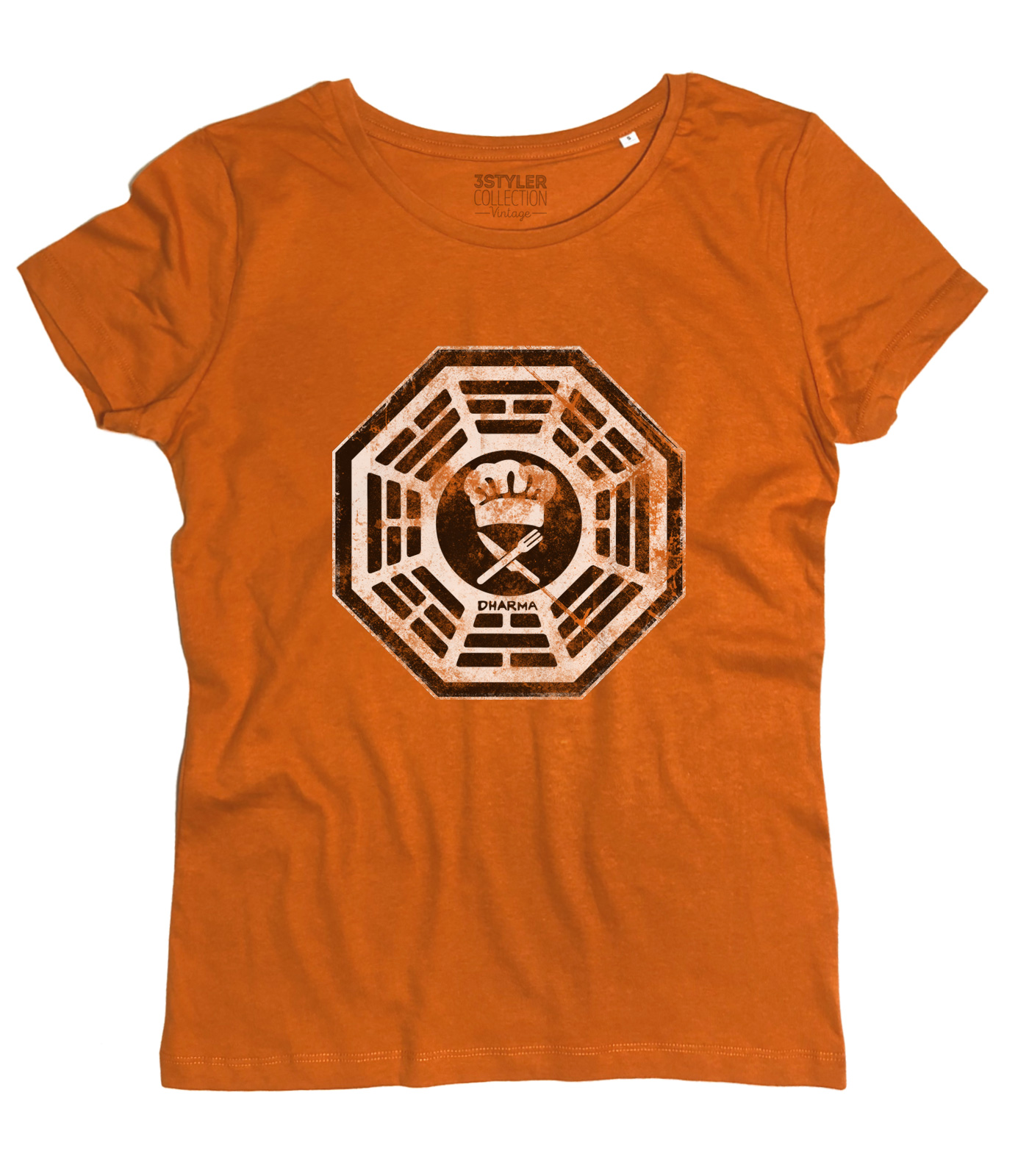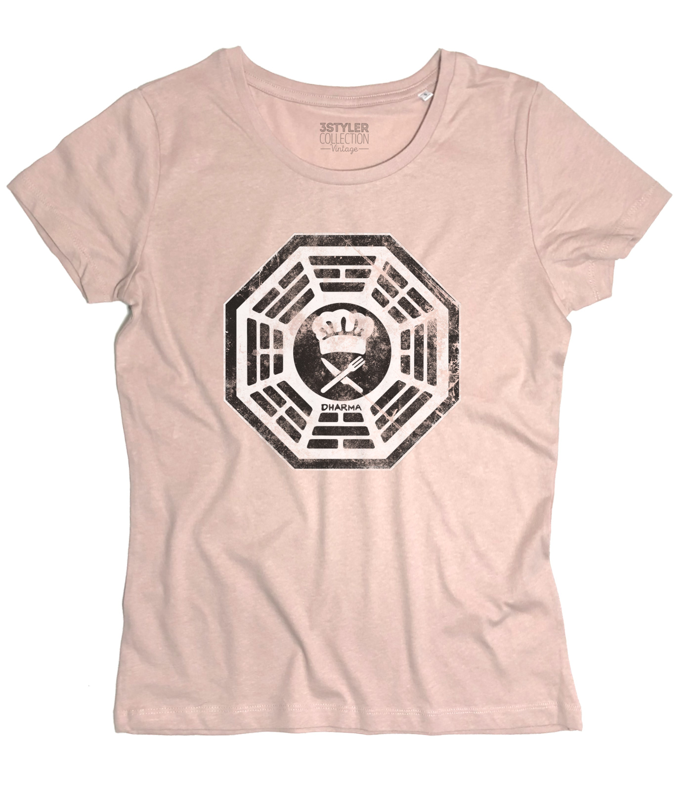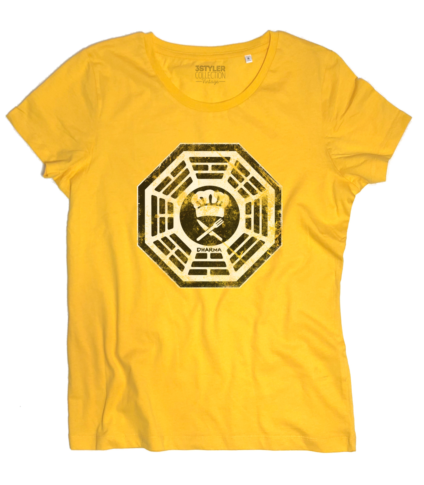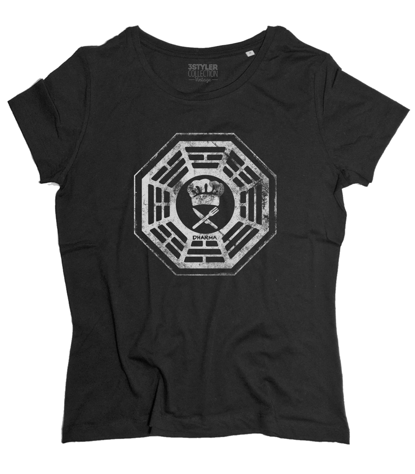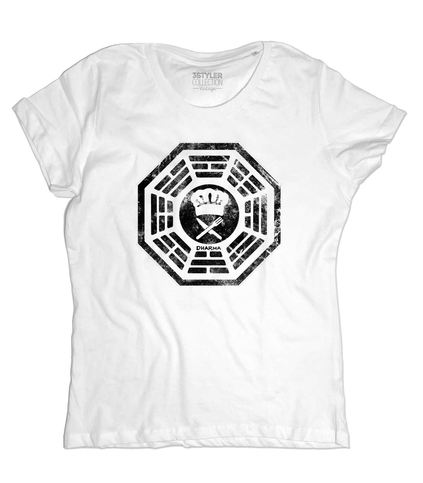 DHARMA Cafeteria t-shirt – T-shirt donna ispirata a Lost, serie televisiva cult entrata ormai a far parte della cultura popolare americana. Il 22 settembre 2004 l’aereo 815 della compagnia australiana Oceanics Airlines, in volo da Sidney a Los Angeles, si schianta su un’isola deserta in mezzo al Pacifico e da quel momento il mondo delle serie TV non è stato più lo stesso. Questa t-shirt raffigura il logo del misterioso Progetto Dharma (Department of Heuristics and Research on Material Applications, “Dipartimento di Euristica e Ricerca su Applicazioni Materiali”), che aveva luogo sull’isola ed in particolare quello indossato da Hurley (Hugo) con la denominazione “Chef” sulla tasca (“Namaste”).