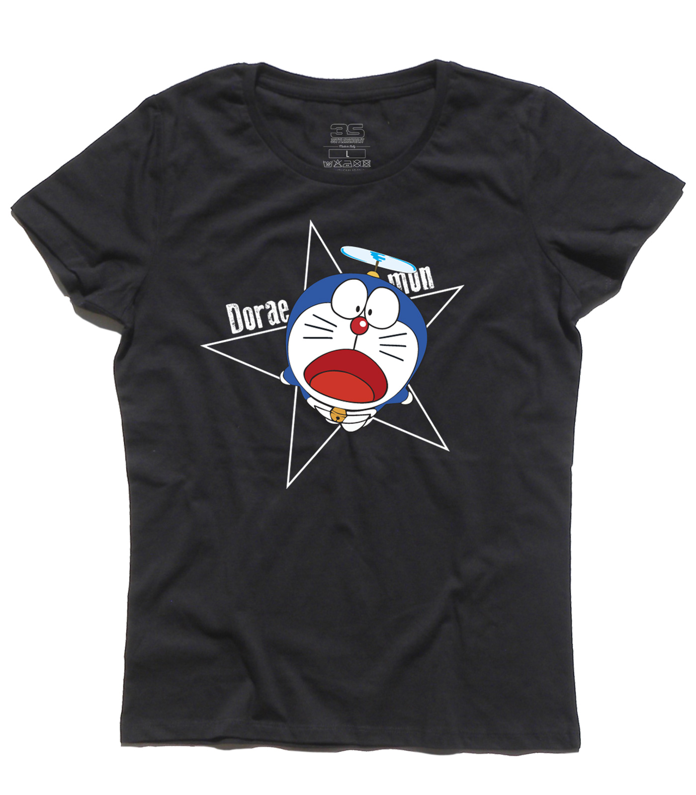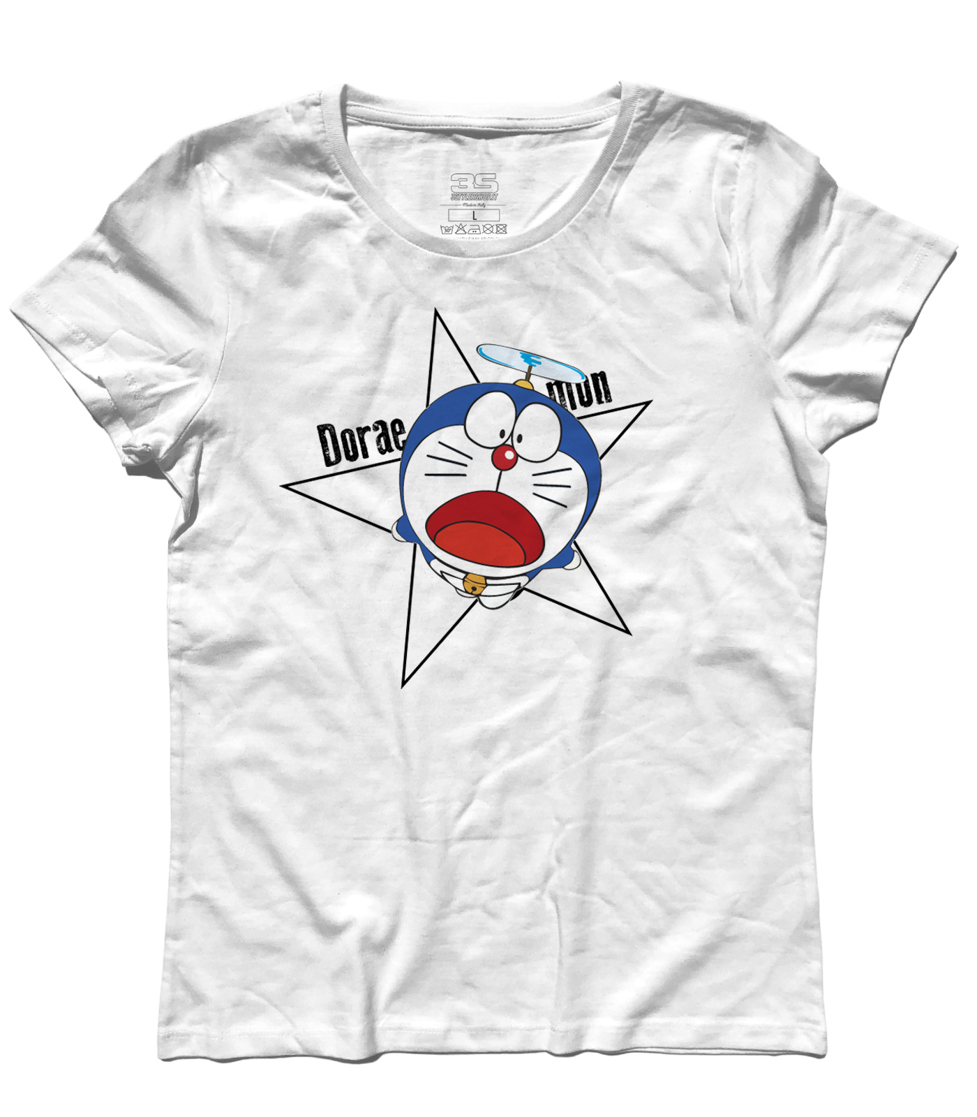 Women’s t-shirt depicting the cute Doraemon, a cute robot cat from space. Its pocket is like the Mary Poppins bag, it contains every possible and imaginable object including a propeller that allows it to fly. Nobi Nobita is his lazy and listless friend and if we want his “mission”. Doraemon in fact has the task of helping him in the study, in which he does not shine, but alas is a bit clumsy and always combines a sea of trouble!