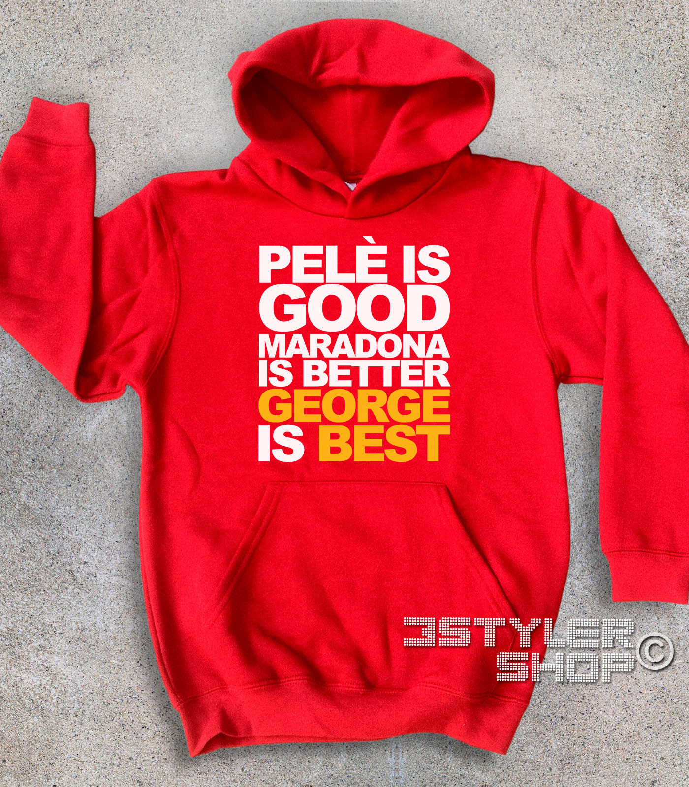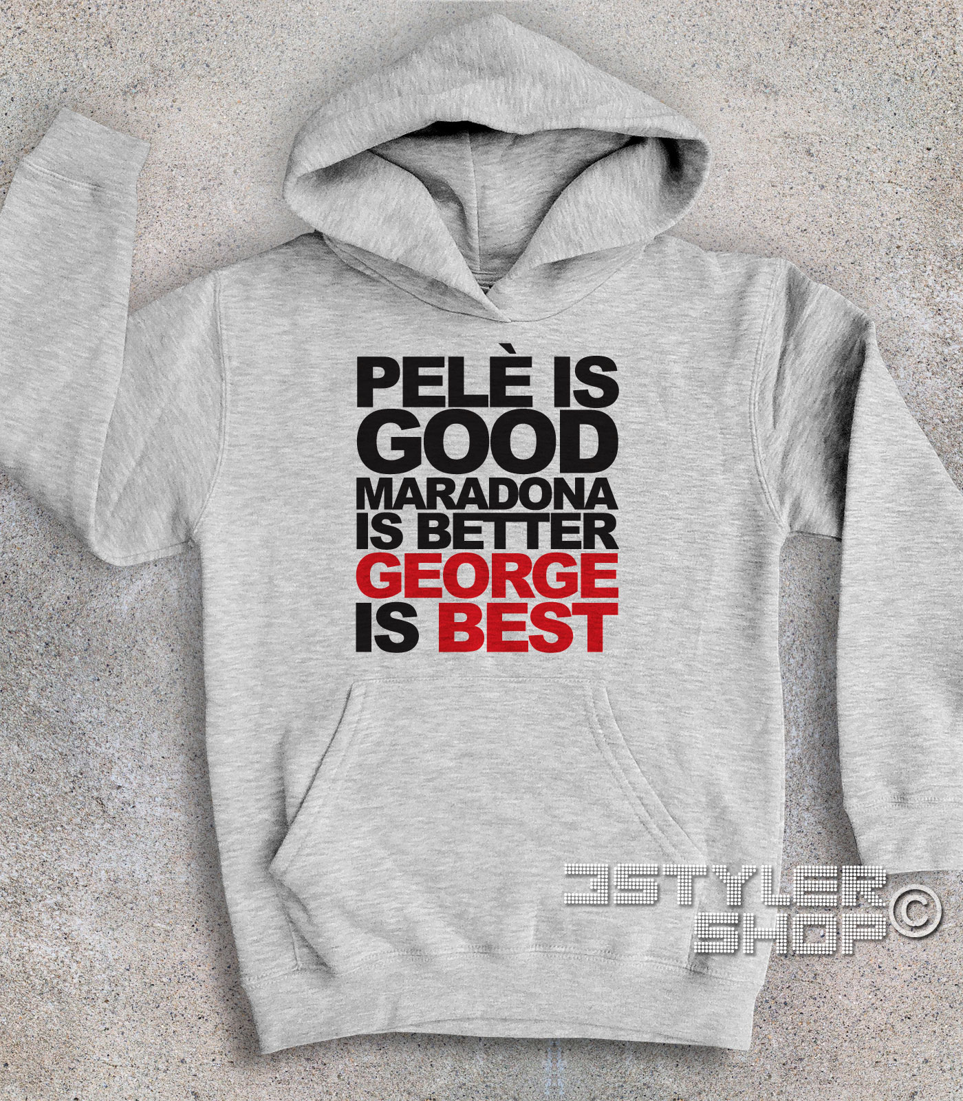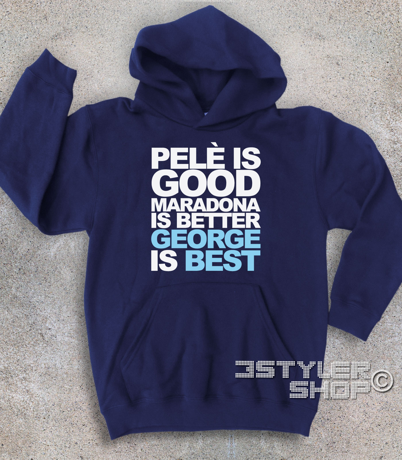 Best felpa – Felpa bambino con frase “Pelè is good, Maradona is better, George is Best”. Questa frase nasce in una calda serata d’estate: qualche birra in riva al mare, la lingua che si scioglie e per caso un gioco di parole, uno dei tanti, che nasce. Da qui la creazione di questa felpa e della t-shirt, in vendita ormai da tanti anni su 3stylershop.it, che ha raggiunto la “fama” grazie allo speciale di Buffa su Sky su George Best. Purtroppo la t-shirt mostrata da Buffa non era la nostra, ma quella di un nostro competitors a cui evidentemente il nostro gioco di parole era piaciuto.