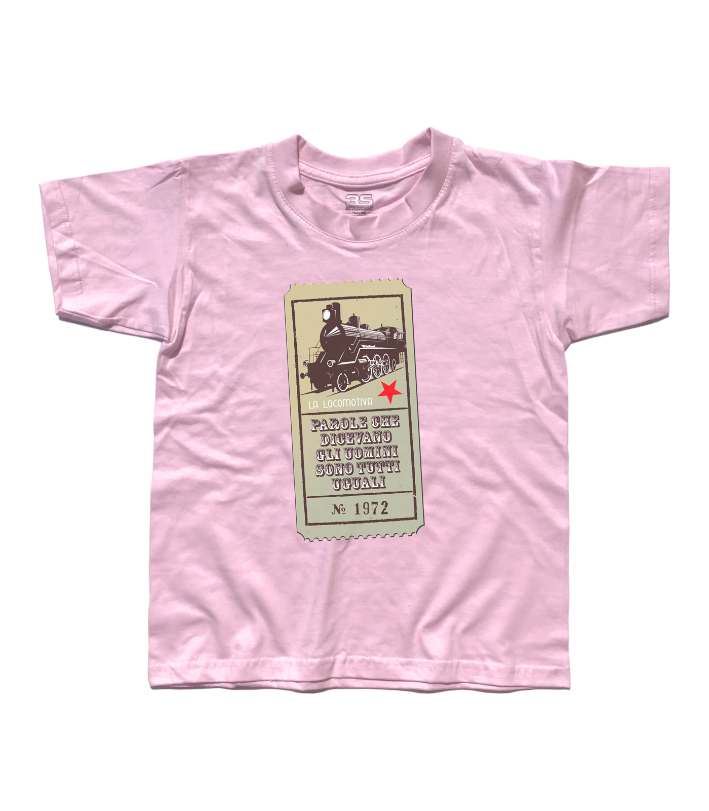 Kid’s t-shirt with the image of a train ticket with the phrase “Words that said men are all the same” taken from the famous song by Guccini the Locomotive. Guccini is one of the most important and well-known Italian musicians and songwriters. His official debut dates back to 1967 with the LP Folk Beat n1: in his forty-year career he has released over twenty albums. He is also a writer and sporadic actor, author of soundtracks and comics; he is also involved in lexicology, lexicography, glottology, dialectology, etymology, translation, theater and is the author of songs for other performers. He is considered one of the exponents of the school of Italian singer-songwriters, the texts of his pieces are often used assimilated in poetic components, denoting a familiarity with the use of the verse of the story by the subject of teaching in schools as they are used by contemporary poet. In addition to the appreciation of the critics, Guccini finds a vast popular following, being considered by some the singer-songwriter “symbol”, a horse of three generations.