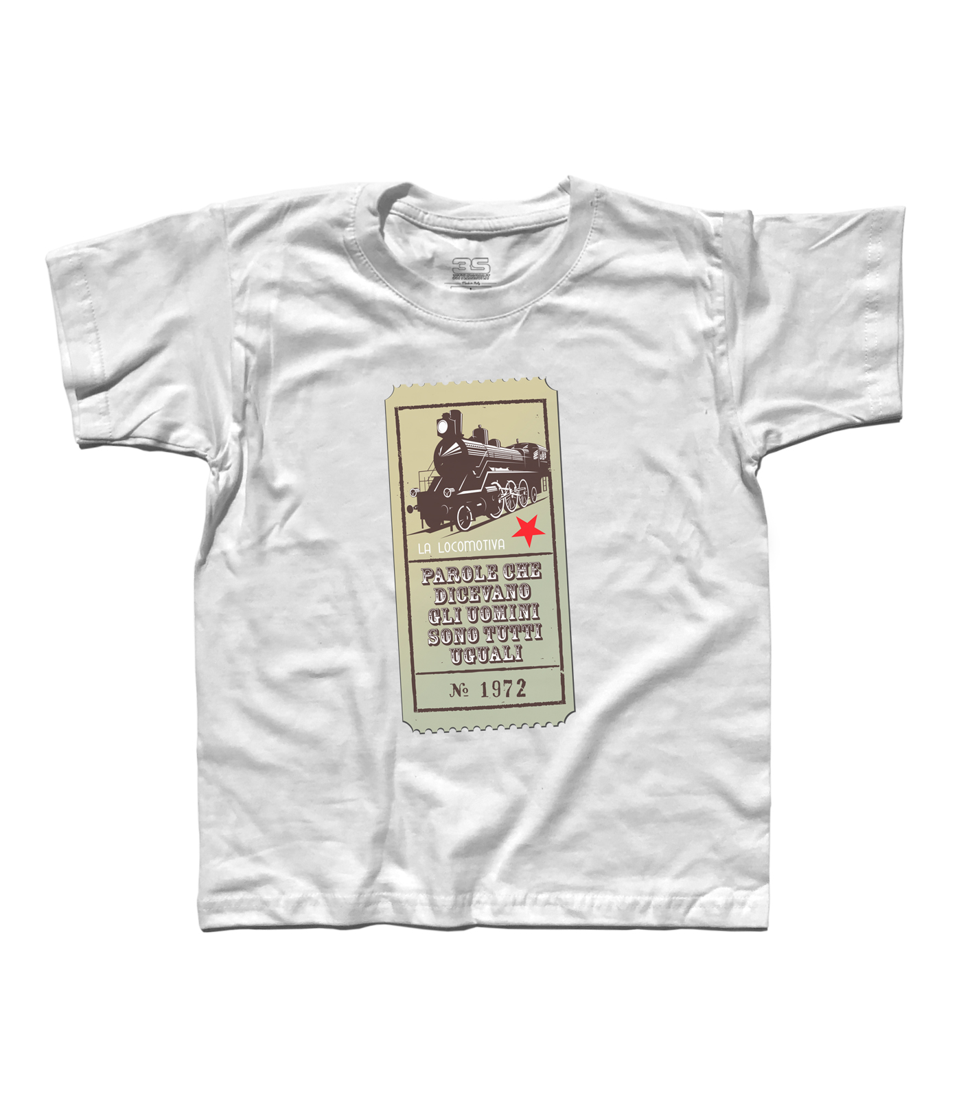 T-shirt bambino con l’immagine di un biglietto del treno con frase “Parole che dicevano gli uomini sono tutti uguali”, tratta dalla celebre canzone di Guccini la Locomotiva. Guccini è uno dei musicisti e cantautori italiani più importanti e noti. Il suo debutto ufficiale risale al 1967 con l’LP Folk Beat n1. Nella sua carriera ultra quarantennale ha pubblicato oltre venti album. È anche scrittore e sporadicamente attore, autore di colonne sonore e di fumetti. Si occupa inoltre di lessicologia, lessicografia, glottologia, dialettologia, etimologia, traduzione, teatro ed è autore di canzoni per altri interpreti. È ritenuto uno degli esponenti di spicco della scuola dei cantautori italiani. I testi dei suoi brani vengono spesso assimilati a componimenti poetici, denotando una familiarità con l’uso del verso tale da costituire materia di insegnamento nelle scuole come esempio di poeta contemporaneo. Oltre all’apprezzamento della critica, Guccini riscontra un vasto seguito popolare, venendo considerato da alcuni il cantautore “simbolo”, a cavallo di tre generazioni.