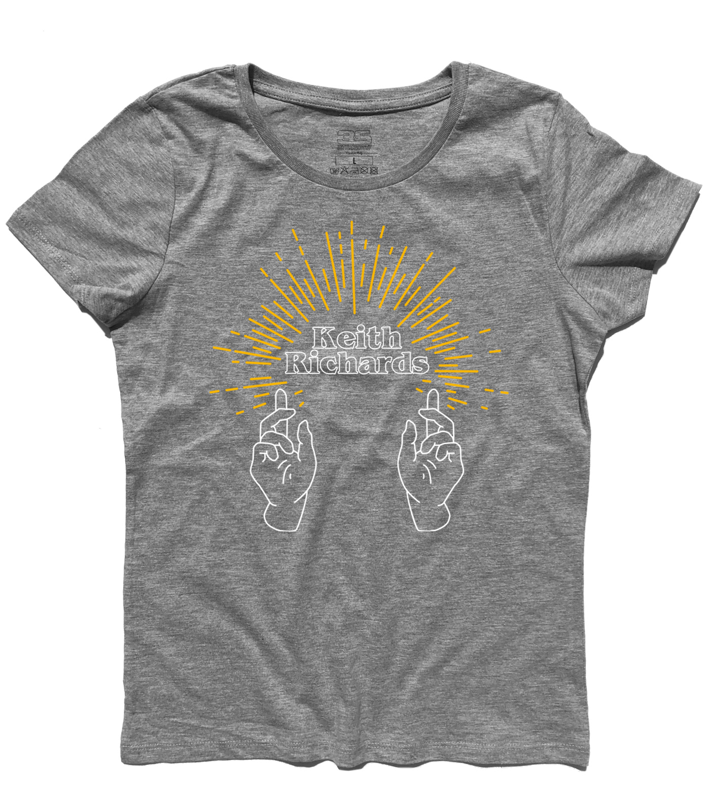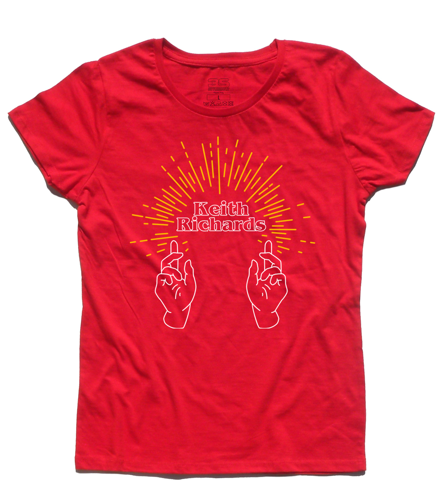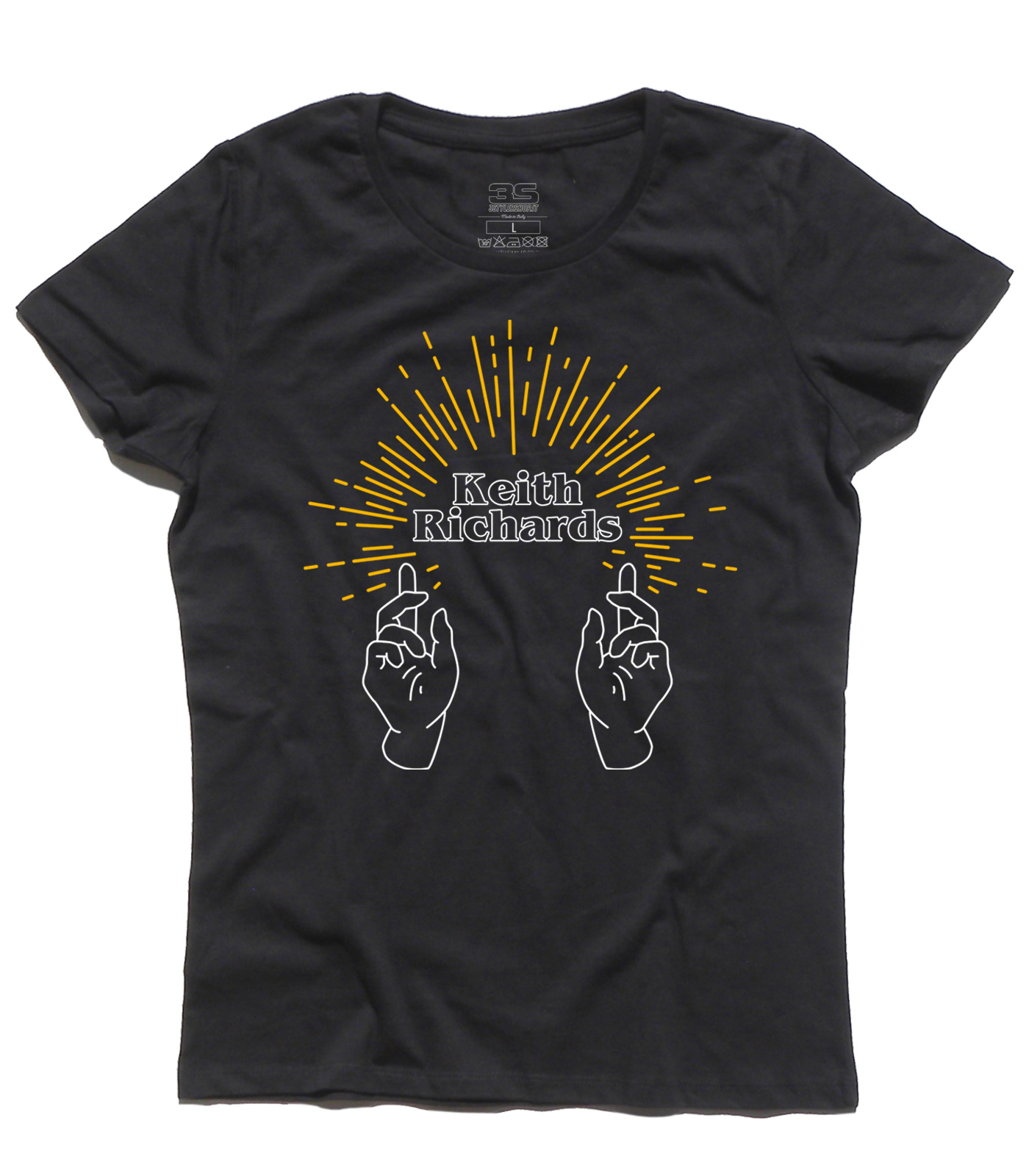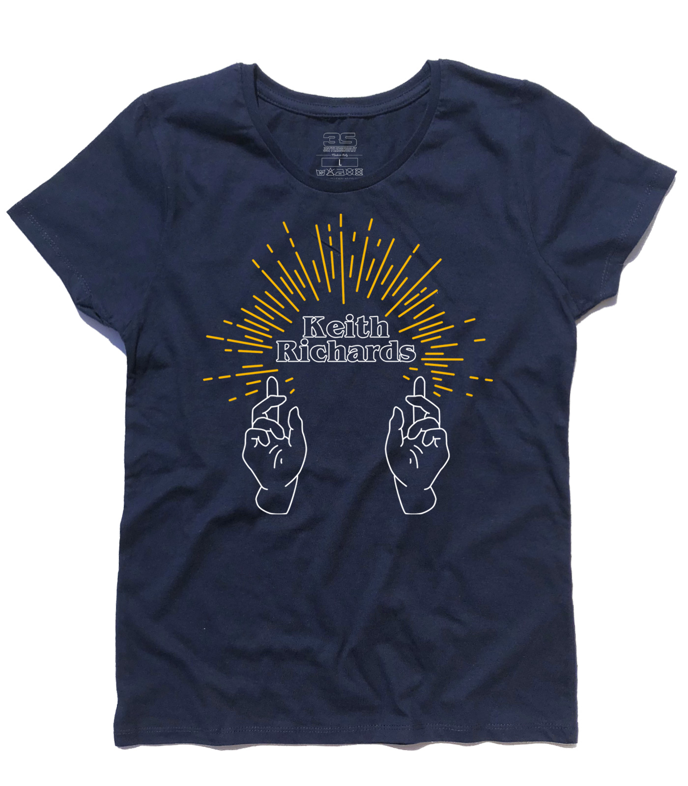 T-shirt donna ispirata a Keith Richards, anima e chitarrista dei Rolling Stones. Volutamente la grafica ricorda le immagini sacre della Chiesa: due mani rivolte verso l’alto come in preghiera e dei raggi che si irradiano dal nome del genio musicale, Keith Richards. Controverso, ribelle, generoso, ne ha combinate di tutti i colori, ma non si riesce a non amarlo. Perchè è un genio e suona la chitarra come nessuno. Perchè sul palco a 76 anni si scatena come un ragazzino di 15 anni e prende in giro Mick Jagger, anche se gli vuole un bene dell’anima. Perchè lancia degli sguardi a Ronnie Wood da far invidia a Bruce Spristing e Patti Scialfa. Perchè quando canta Happy fa finta di suonare la chitarra e non si vergogna a dirlo, perchè ha scritto delle canzoni immortali, perchè, perchè… perchè è Keith Richards, punto.