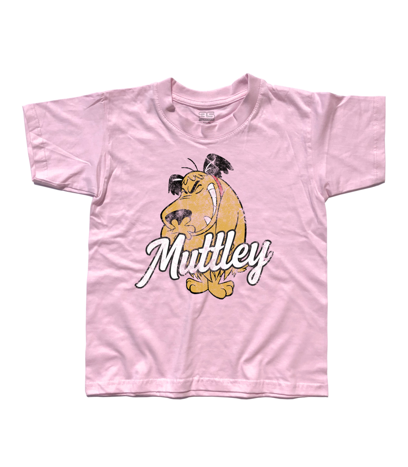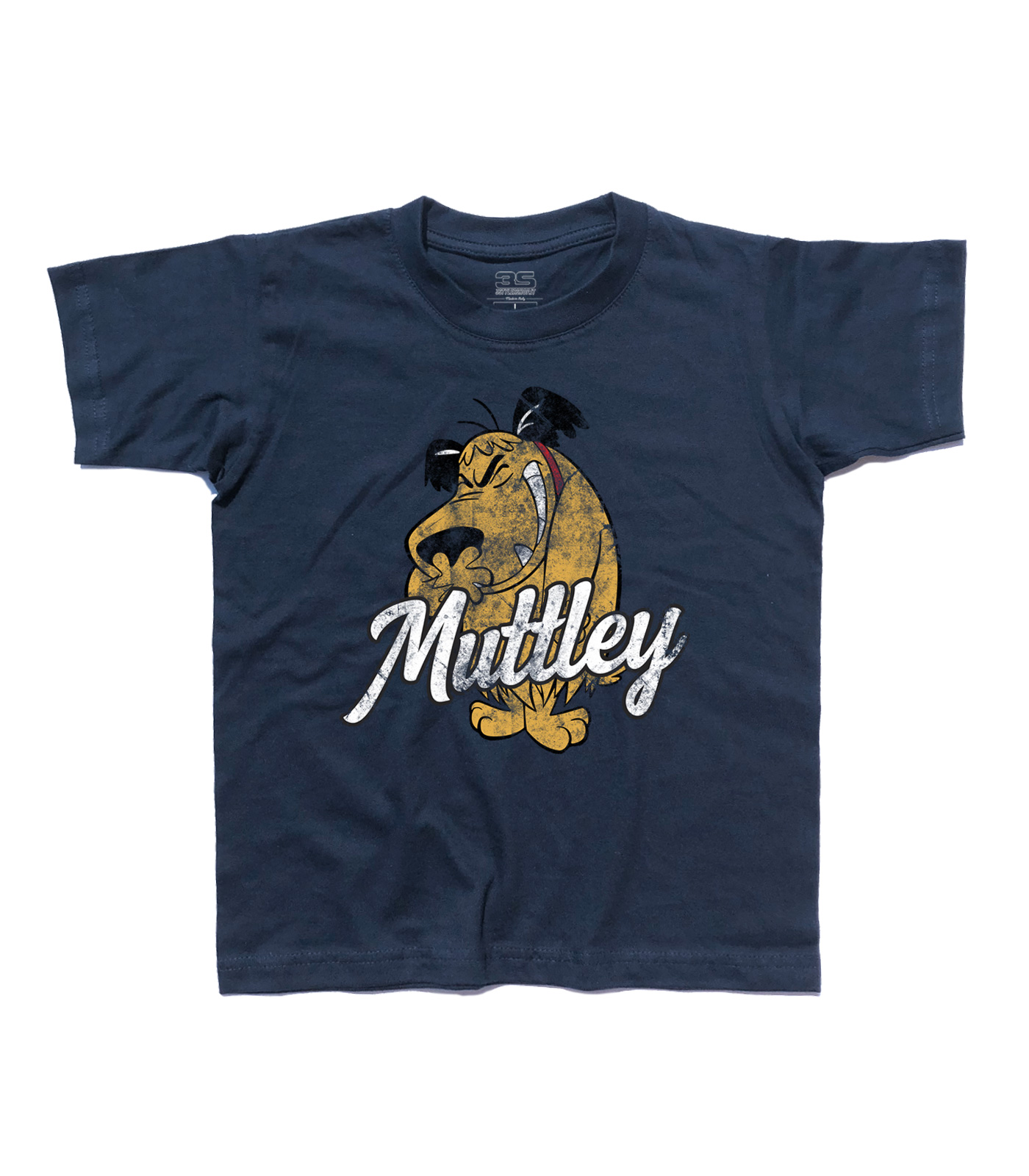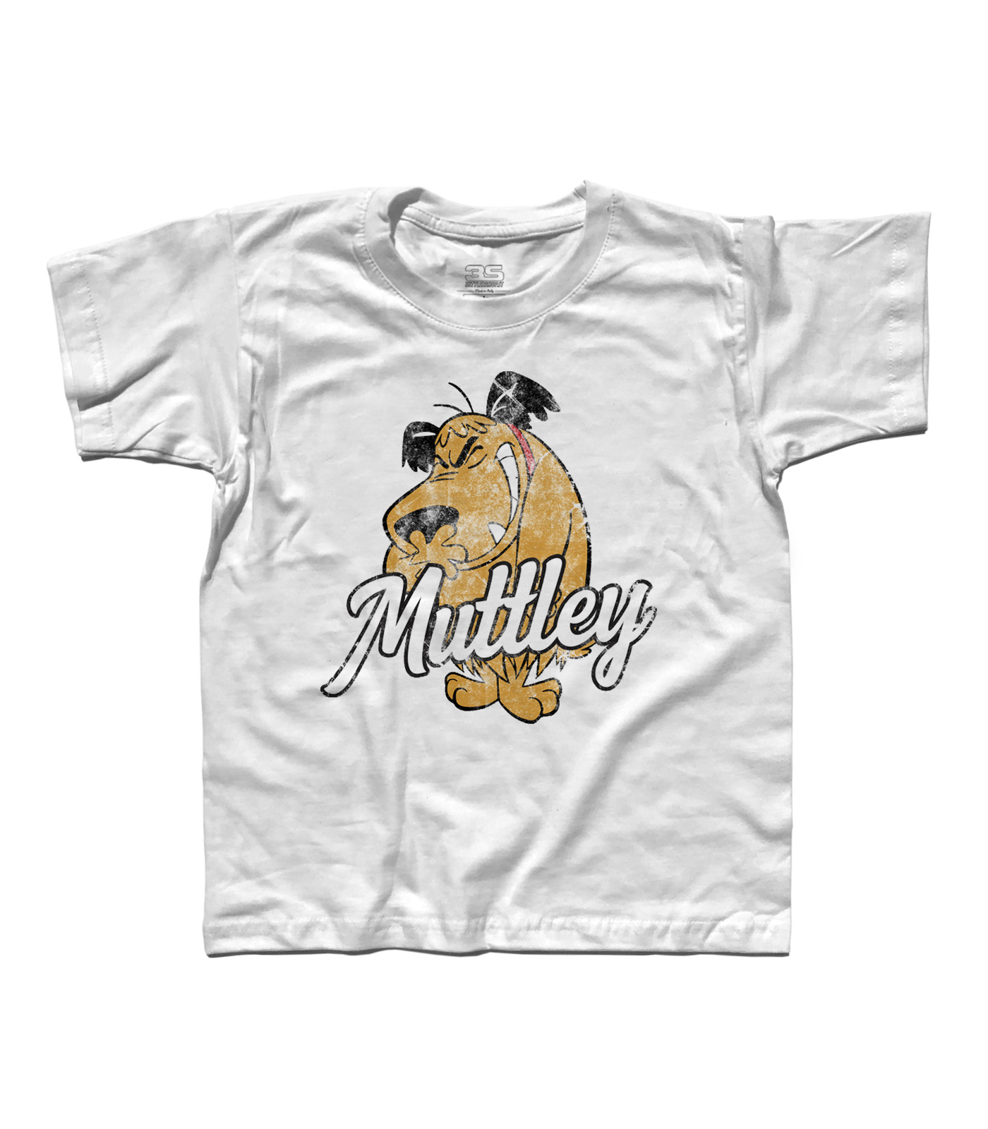 T-shirt bambino raffigurante Muttley, personaggio della scuderia Hanna & Barbera e spalla di Dick Dastardly, il cattivo della serie Wacky Races. In quanto cane non dovrebbe parlare: tuttavia pronuncia “sì”, “medaglia” o grugniti riconducibili al linguaggio umano. Mitica e famosissima è la sua risata asmatica, che di solito si scatena a spese di Dick. Una curiosità: il celebre “Medaglia, Medaglia” è un’invenzione del doppiaggio in italiano. Nella versione inglese Muttley si limita ad emettere una serie di grugniti di approvazione verso Dick Dastardly quando gli chiede se vuole la medaglia.