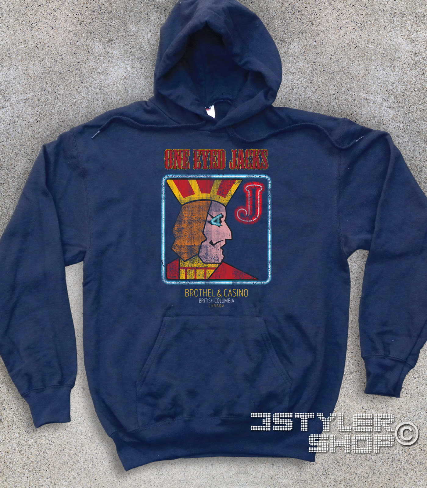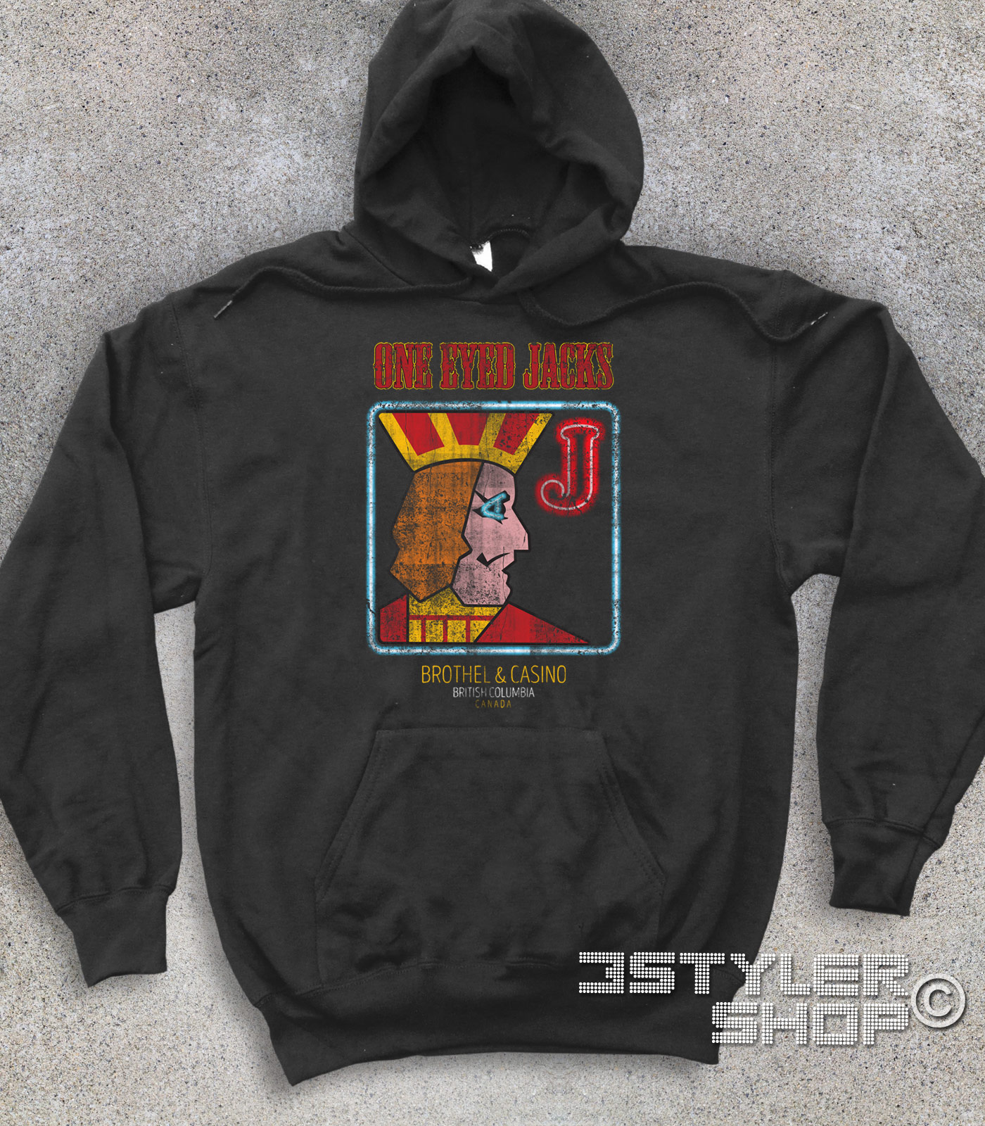 Twin Peaks felpa – Felpa unisex ispirata alla serie televisiva cult “I segreti di Twin Peaks”. La t-shirt raffigura l’insegna del bordello casinò chiamato One eyed Jacks (che tradotto significa Jack con un occhio solo) situato oltre il confine in cui lavorò per un breve periodo Laura Palmer. In esso si trovavano una sala giochi, un bar e vari privée in cui i clienti potevano appartarsi con le ragazze.
