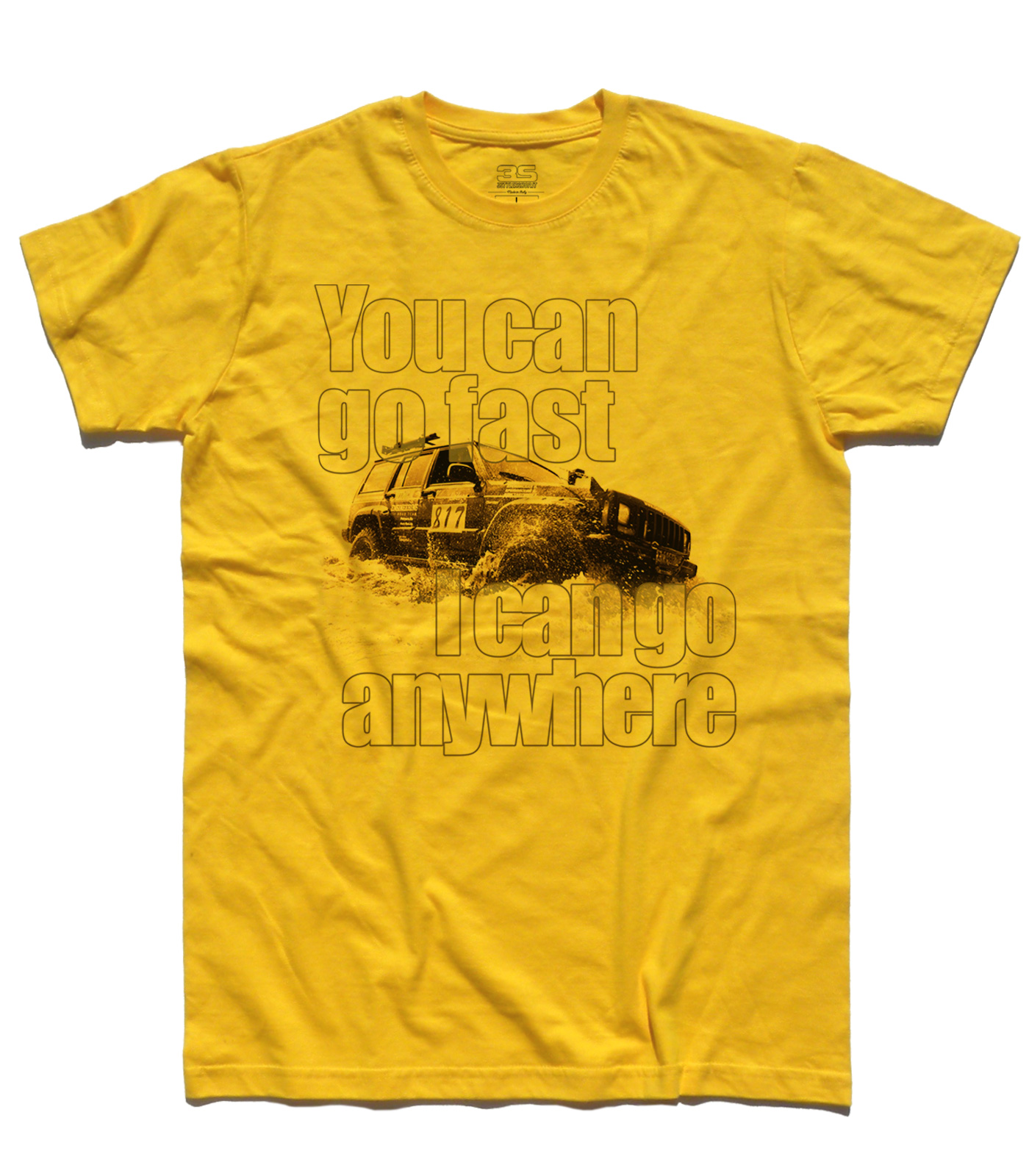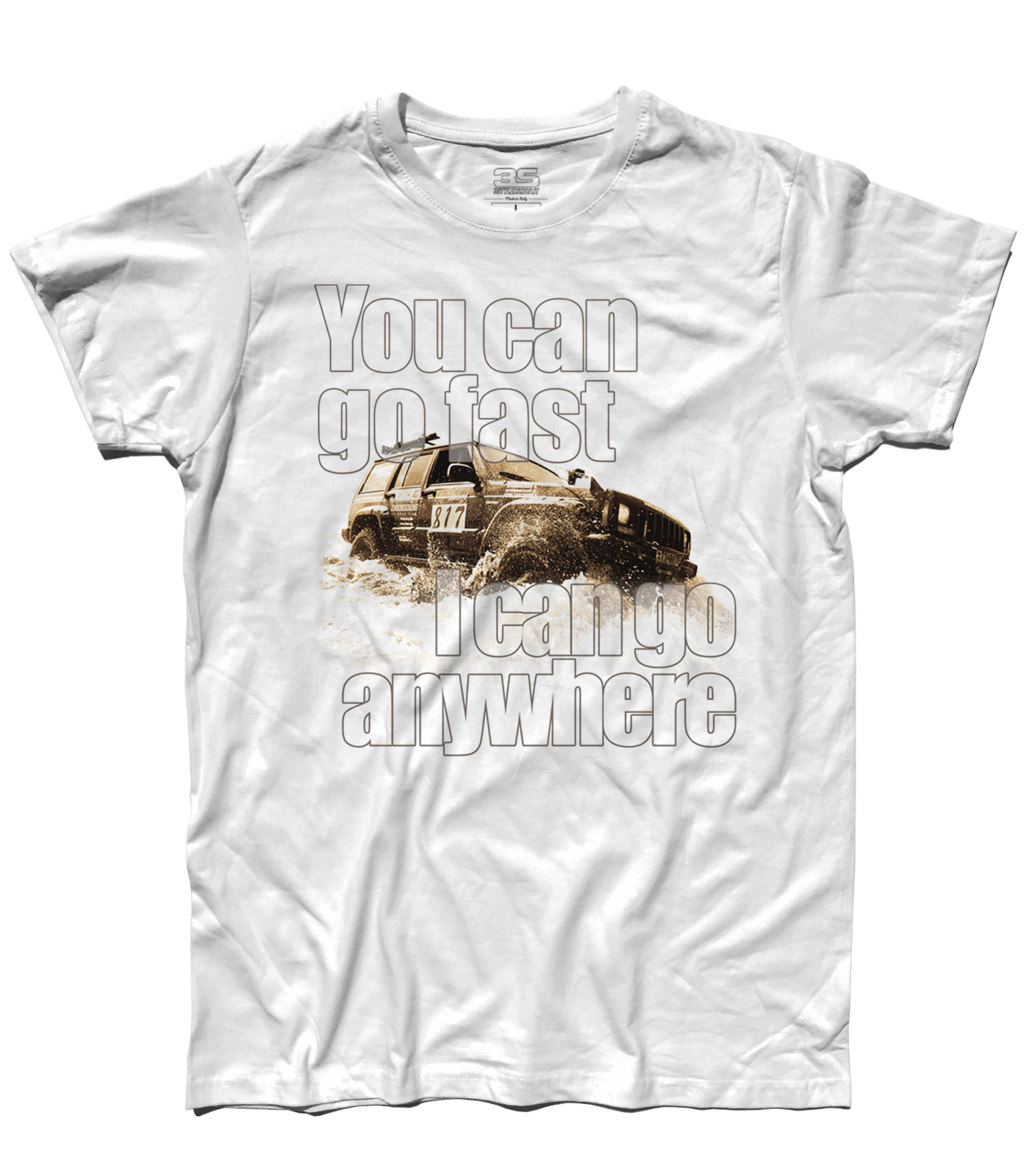T-shirt uomo con una frase che nel mondo dei fuoristrada è molto conosciuta: “You can go fast, I can go anywhere”. Tu puoi andare veloce, ma io posso andare ovunque. Perchè se hai una Jeep ciò che importa non è quanto puoi andare veloce, certi primati li lasciamo alle Ferrari. Ma ciò che importa è che possiamo andare ovunque vogliamo!